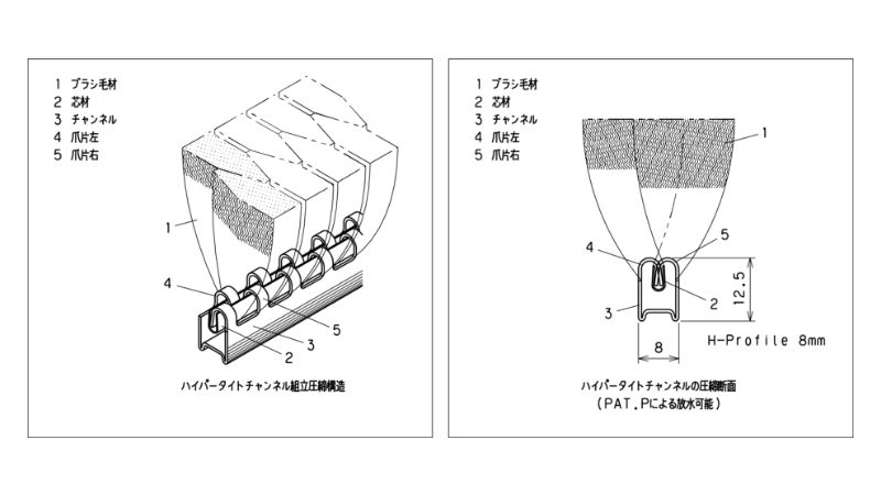 - ブラシロールを構成する「SK型ハイパータイトチャンネルブラシ」は、H型チャンネルの左右から延ばした爪の間にブラシ束を連続挿入し、斜めに交叉させた爪と芯材によって強固に押さえた、大型ブラシロールに最適な構造のチャンネルブラシです。